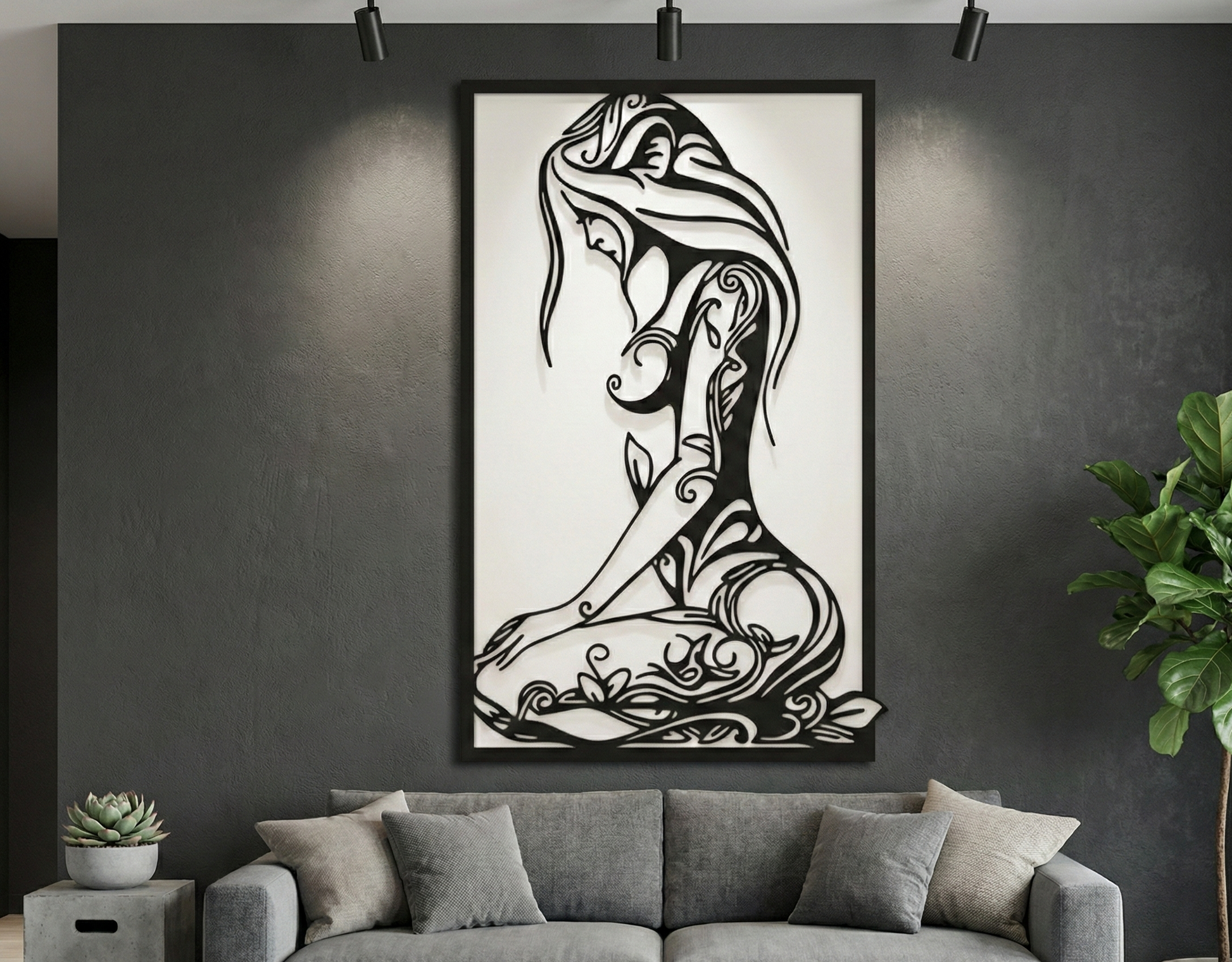 Τρισδιάστατο (3D) Βάθος: Η μαύρη ξύλινη μορφή τοποθετείται πάνω σε ολόλευκη πλάτη, δημιουργώντας μια έντονη αντίθεση που αναδεικνύει το ανάγλυφο του σχεδίου και δίνει ζωντάνια στον τοίχο.