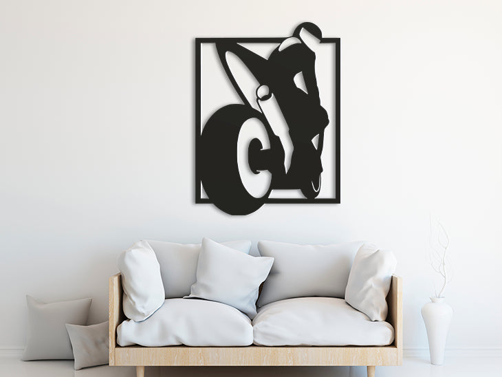 Αυτό το δυναμικό διακοσμητικό απεικονίζει μια μοτοσυκλέτα σε εντυπωσιακή κλίση, αποδίδοντας την απόλυτη αίσθηση της ταχύτητας και της ελευθερίας. Με σύγχρονο γεωμετρικό σχεδιασμό, αποτελεί το ιδανικό κομμάτι για τους λάτρεις των μηχανών που θέλουν να δώσουν έναν industrial και "rebel" χαρακτήρα στον χώρο τους.